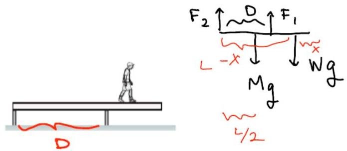 The upward force exerted by the left on the beam cannot be negative – this is the limiting condition on how far the child can be to the right. Let's set up the static equilibrium condition with the pivot about the left end of the beam.