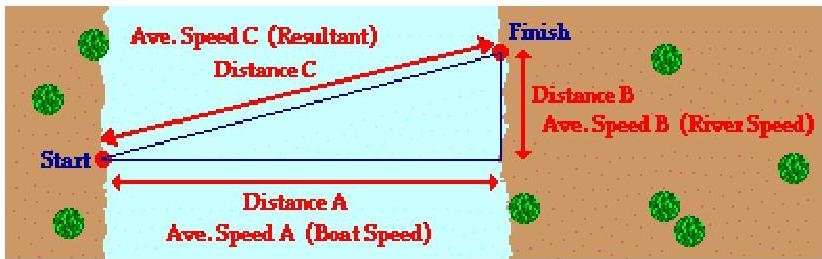 The boat's motor is what carries the boat across the river the Distance A; and so any calculation involving the Distance A must involve the speed value labeled as Speed A (the boat speed relative to the water). Similarly, it is the current of the river that carries the boat downstream for the Distance B; and so any calculation involving the Distance B must involve the speed value labeled as Speed B (the river speed). Together, these two parts (or components) add up to give the resulting motion of the boat. That is, the across-the-river component of displacement adds to the downstream displacement to equal the resulting displacement.