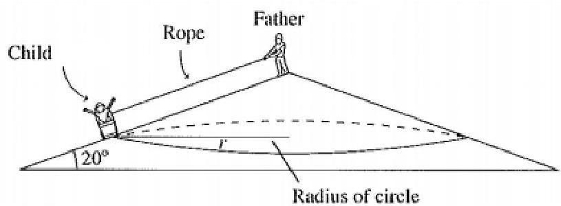 The father of a 20kg child stands at the summit of a conical hill as he spins a 2.0m long rope. The sides of the hill are inclined at 20 degrees. He again keeps the rope parallel to the ground and friction is negligible. What rope tension will allow the cart to spin the same 14rpm it had?