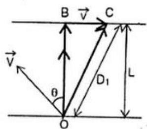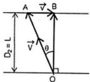 Suppose the boat starts in travelling in a direction making an angle with OB as shown in the figure. If L is the width of the river, time taken by the boat to cross the river will be