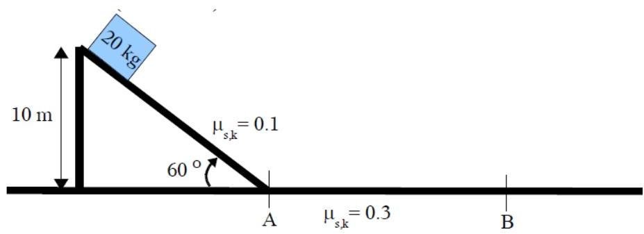 A 20kg block starts from rest at the top of a 60 degree incline and slides down the incline. There is a 0.1 coefficient of friction on the ramp. The block then continues to slide along the horizontal surface where there is a 0.3 coefficient of friction. The block then slows, due to friction, until it comes to rest at point B.