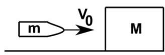 A wooden block with mass is lying on a horizontal table. It is hit by a bullet with mass which moves horizontally. The bullet remains in the block after colliding with it. The block moves on the table a distance . The coefficient of kinetic friction . Find the starting speed of the bullet.