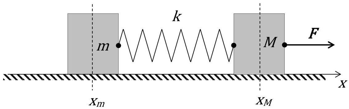 2 blocks of mass m and M are connected by a string of constant k . The blocks are kept on a constant horizontal plane and are at rest. The spring is unstretched when a constant force F starts acting on the block of mass M to pull it. Find the maximum extension of the spring.