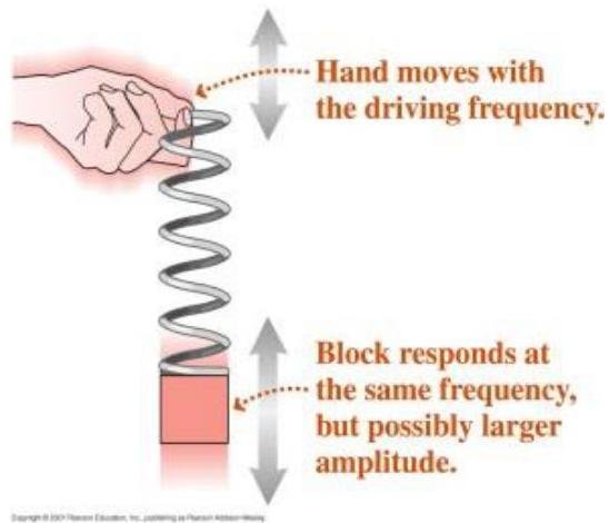 For example, in the case of the (vertical) mass on a spring the driving force might be applied by having an external force (F) move the support of the spring up and down. In this case the equation of motion of the mass is given by,