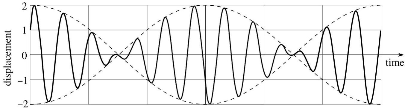 The displacement - time graph of this superposition of signals is shown in Figure for the case where the two equal amplitude original oscillations have frequencies in the ratio 13 : 11.