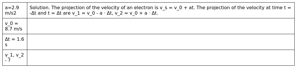 1. An electron has a constant acceleration of +2.9m/s2 . At a certain instant its velocity is +8.7m/s . What is its velocity (a) 1.6 s earlier and (b) 1.6 s later?