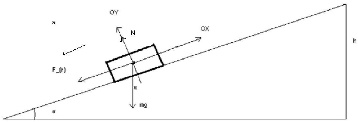 OX:−ma=−Fr−mg∗sin(α)OY:N=mg∗cos(α)Fr=μN→a=g(sin(α)+μ∗cos(α))