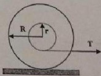 5/ (20 pts) A yo-yo of mass M, rotational inertia I, and inner and outer radii r and R, is gently pulled by a string with tension T on a rough floor as shown in Figure 1. Calculate the linear acceleration of the yo-yo.