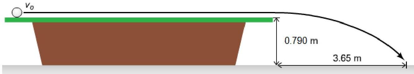 The top of the pool table is 0.790m from the floor. The placement of the tape is such that 0m is aligned with the edge of the table (as shown). The winner of the competition wants to know if he has broken the world record for the break shot of 32mph (about 14.3m/s ). If the winner's ball landed a distance 3.65m from the table edge, calculate his break shot speed. Also need to know at what speed did his pool ball hit the ground.