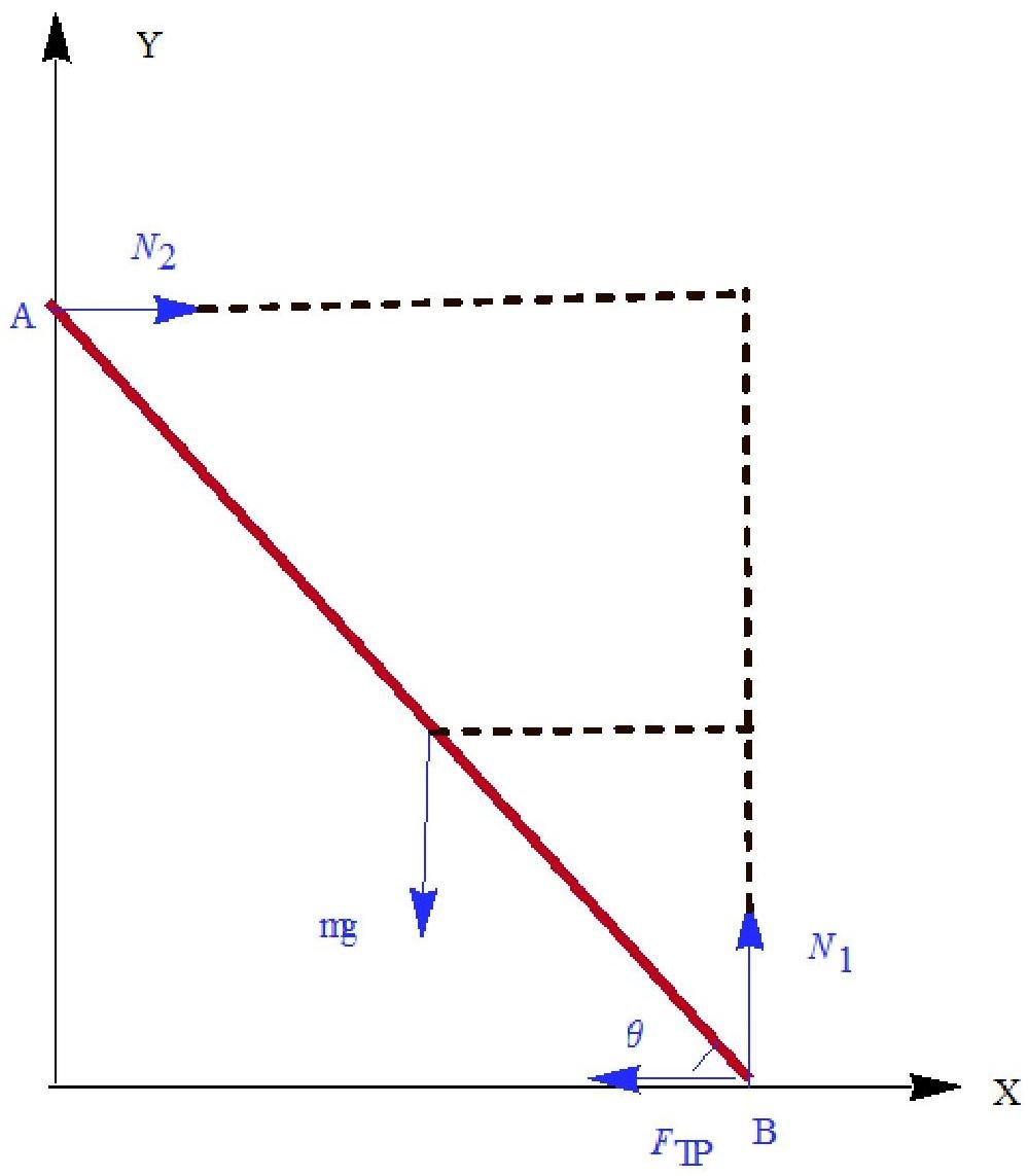 where m is the mass of ladder; g=9.8m/s2 is the gravity acceleration; N1 is the reaction force of floor; N2 is the reaction force of wall; FTP=N1μS is the force of friction between ladder and floor.