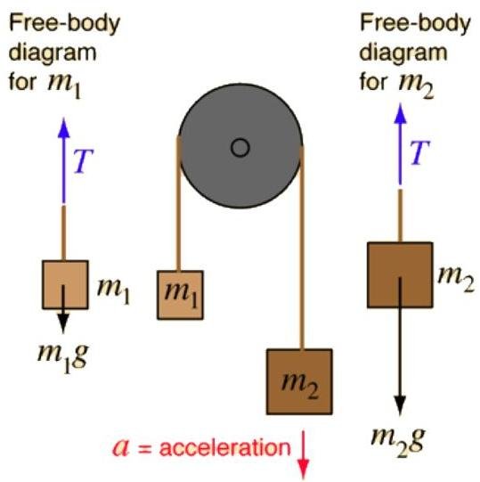 m1a+m2a=−m1g+T−T+m2gm1a+m2a=m2g−m1g=g(m2−m1)