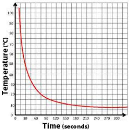 In an experiment to verify Newton's law of cooling, the temperature of hot water in a calorimeter is plotted against time t/min. Which of the following is true about the graph?
