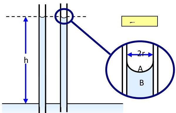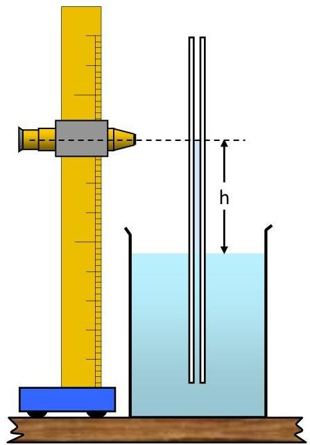 Using either a ruler or the travelling microscope measure the difference in levels between the water in the beaker and the bottom of the water meniscus in the capillary tube (h).