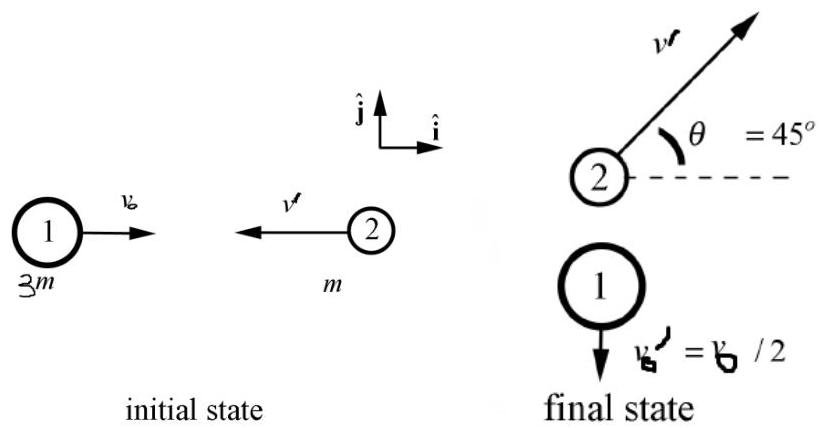 particle 1 of mass 3m initially moving with a speed vo in the positive x direction collides with particle 2 of mass m moving in opposite x direction with unknown speed v. After collision particle 1 moves along the negative y direction with speed 2vo and particle 2 moves with v' in a direction making angle of 45deg with positive x direction. Determine v and v'.