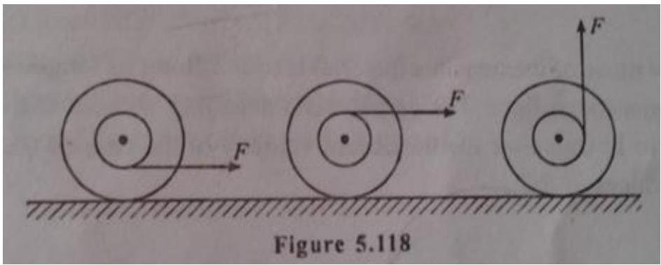 5.20 Figure -5.118 shows three identical kiting spools at rest on a rough horizontal ground initially. In each case the string is pulled in the direction shown in figure. In each case it is given that spools rolls without slipping. In what direction will each