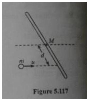 5.14 A stick of length lies on horizontal table. It has a mass and is free to move in any way on the table. A ball of mass , moving perpendicularly to the stick at a distance from its center with speed collides elastically with it as shown in figure - 5.117. What quantities are conserved in the collision? What must be the mass of the ball so that it remains at rest immediately after collision.