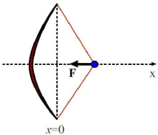 While a bow string is not literally spring, it may behave like one in that it exerts a force on the thing attached to it (like a hand!) that is proportional to the distance of pull from the equilibrium position. The correspondence is illustrated in Fig.