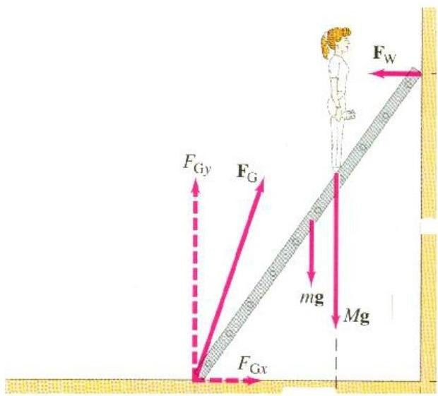 The weight of the person on the ladder: 15Mg N at an angle of 50∘ at a distance of x m from the bottom of the ladder. Torque2=x⋅15Mg⋅cos(50∘) (CW)