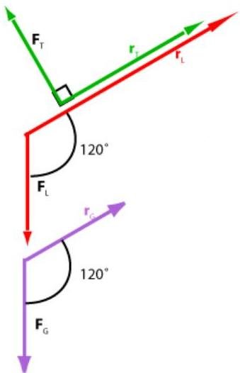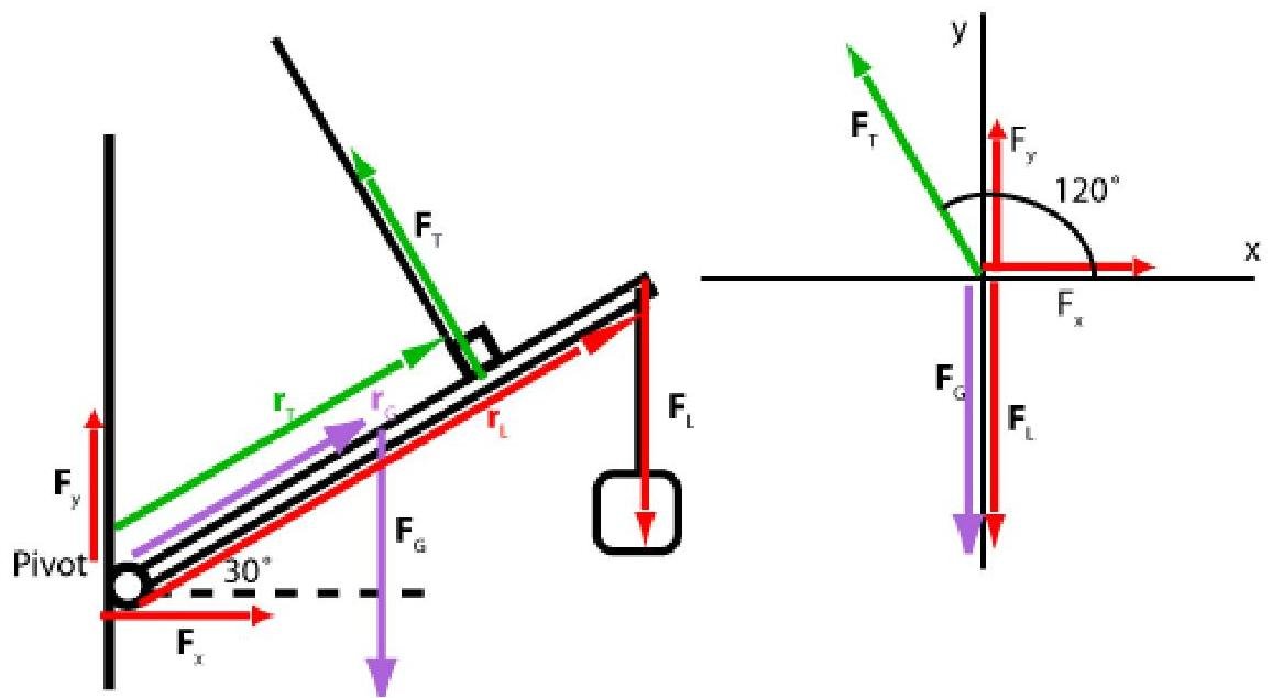 To solve this problem we will assume that the tension in the cable is . We will begin with forces exerted on the boom: the weight of the boom acts at the center of the mass from the pivot; the load is a force acting downward (it is really tension in the wire from which the load is suspended) and it acts at a distance from the pivot; the tension acts at a distance from the pivot; and finally, the force exerted on the boom by the hinge is broken in the diagram below into two components and . Since the boom is in equilibrium we are free to choose the axis as shown in the diagram. Note that we have colour coded each force and its arm lever.