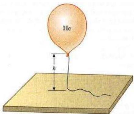 A helium-filled balloon is tied to a 2.00-m-long, 0.050 0-kg uniform string. The balloon is spherical with a radius of 0.400m . When released, the balloon lifts a length h of string and then remains in equilibrium. Determine the value of h . The envelope of the balloon has a mass of 0.250 kg.