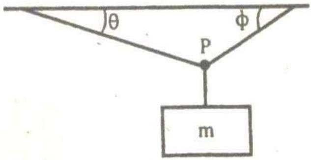 A rope is hung at both ends from a horizontal beam, and a weight m is suspended from it. The left part of the rope exerts a force G at P, while the right part of the rope exerts a force H. Find the indicated quantities from the given data.