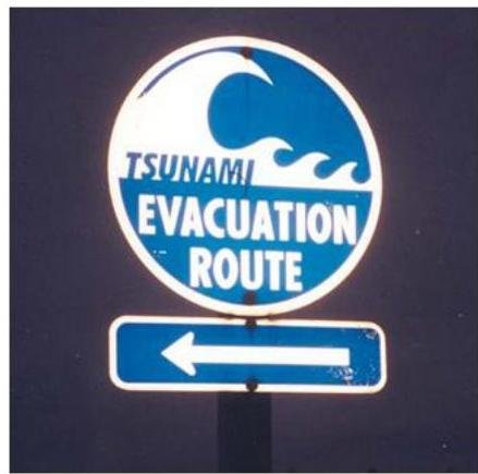 A sign indicating the way to escape from a tsunami on the road (Washington, USA)