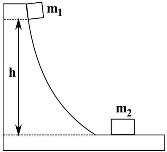 two blocks are free to slide along the frictionless, wooden track. The block of mass m1=5 kg is released from the position shown, at height h=5m above the flat part of the track. Protruding from its front end is the north pole of a strong magnet, which repels the north pole of an identical magnet embedded in the back end of the block of mass m2=0 kg, initially st rest. The two blocks never touch. Calculate the maximum height to which m2 rises after the elastic collision