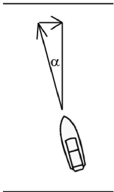 To cross the river in the shortest path, the boat must move perpendicular to the shores. Therefore, the boat should move at a specific angle , so that its own speed will compensate the lateral displacement caused by the flow speed: