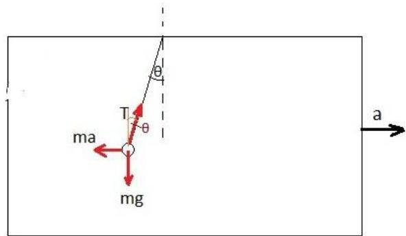Inside of the car speeding up on a horizontal road with acceleration 'a'.