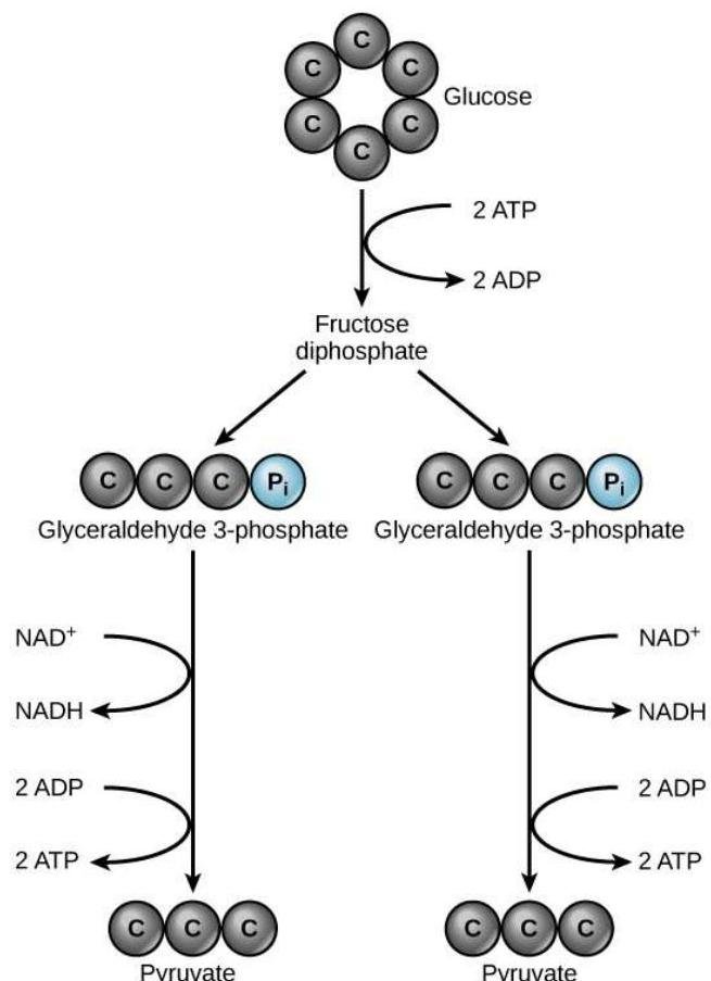 Glycolysis is the metabolic pathway that converts glucose , into pyruvate, . Glycolysis utilize G-3-P as a substrate. In this process an additional phosphate group (not from ATP) is first added to each G-3-P (not shown in the figure). This addition also reduces two NAD+ to two NADH by adding two electrons and a proton to each. At this point, the two phosphates that are on each molecule are removed, and added back to ADP molecules, generating 4 ATP molecules, and 2 pyruvate molecules (Figure 1).