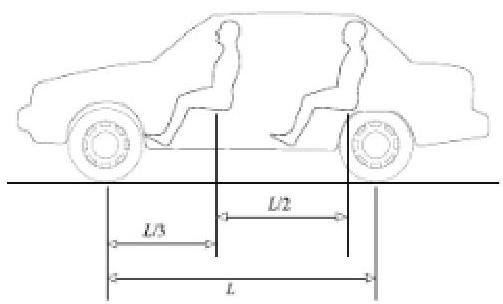 Two people sit in a car that weighs 8000N as shown in the figure. The person at the front weighs 700N while the one in the back weighs 900N . The distance between the front and back wheels is L units. The person on the front is sitting L/3 back from the front wheels. The person on the back is sitting L/2 back from the person on the front. The center of gravity of the car is 0.4L units behind the front wheel. How much force does each front wheel and each back wheel of the car support if the people in the car sit along the centerline of the car?