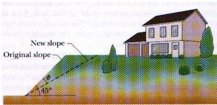 A house is built on the top of a hill with a nearby 45 degrees slope as shown in the figure. An engineering study indicates that the slope angle should be reduced because the top layers of soil along the slope might slip past the lower layers. If the static coefficient of friction between two such layers is 0.5, what is the least angle φ through which the present slope should be reduced to prevent slipping?