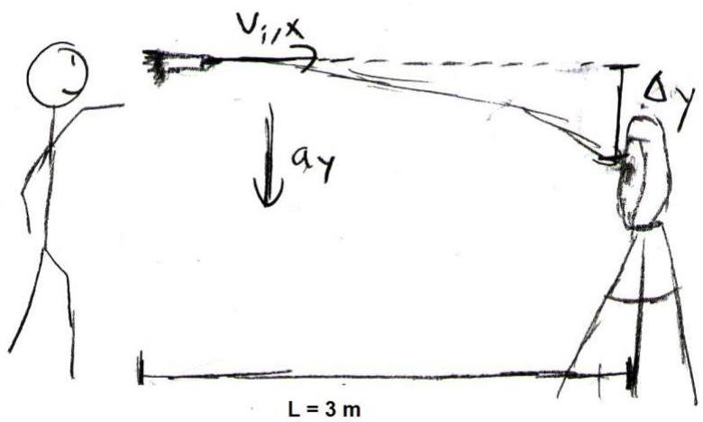 A dart leaves the thrower's hand horizontally at a height of 1.9m above the ground. It strikes the board 3m away at a height of 1.5m above the ground. Calculate the horizontal velocity at which the dart left the thrower's hand