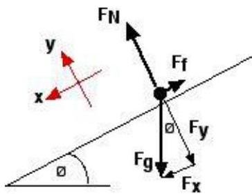 Fx and Fy are components of weight, Fg ; FN is normal force; Ff is friction