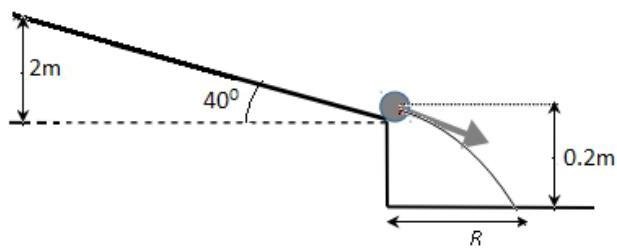 A cylinder of mass M and radius r rolls down a ramp at height of 2m above the ground and eventually takes off the ramp 20cm above the ground at an angle of 40degrees from the x-axis. Assuming the cylinder didn't slipped as it rolls down, calculate the horizantal range at which the cylinder landed on the ground.