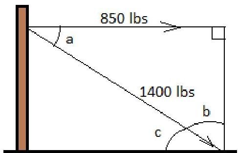cos a = 850 lbs / 1400 lbs = 0.607