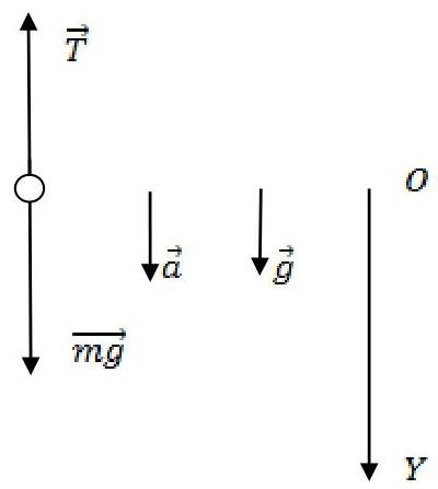 A pendulum bob of mass 50 g is suspended on a string from the ceiling of an elevator which is moving downwards with an acceleration 1.5 ms-2. Draw the free body diagram using the non-inertial frame of reference and determine the tension in the string. (Take g = 10 ms-2)