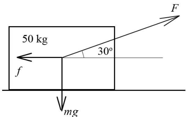A 50kg box is dragged across a floor by pulling on a rope attached to the box and inclined at 30∘ above the horizontal.