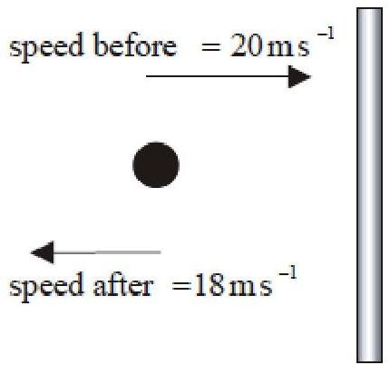 A rubber ball of mass is thrown towards a vertical wall. It strikes the wall at a horizontal speed of 20ms-1 and bounces back with a horizontal speed of 18 ms-1 as shown below. The ball is in contact with the wall for 0.080 s.