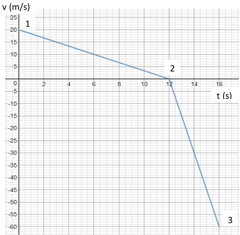 At initial time, s, the velocity is m/s. Put the point 1 on the graph that corresponds to these values. In s the velocity is m/s. Put the point 2 on the graph that corresponds to these values. Since a car decelerates uniformly draw a line 1-2. The area between the line and the time axis on a velocity-time graph, between two times is the displacement change during that time interval. We find that