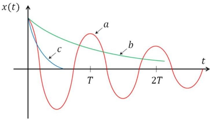 Damping can be light, in which case the system oscillates about the midpoint (a), heavy, in which the system takes a long time to reach equilibrium (b) or critical, where the system reaches equilibrium in a short time compared with with no overshoot, where is the natural period of vibration of the system (c).