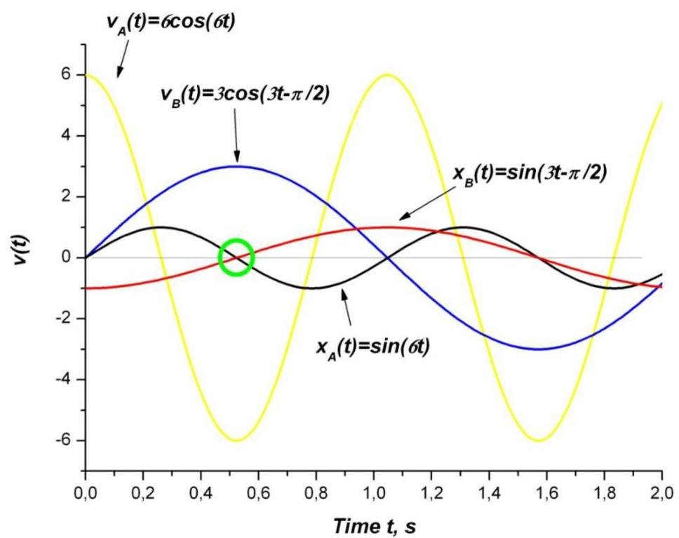 vA(t)=dtdxA(t)=ωAcos(ωAt),vB(t)=dtdxB(t)=ωBcos(ωBt−2π),