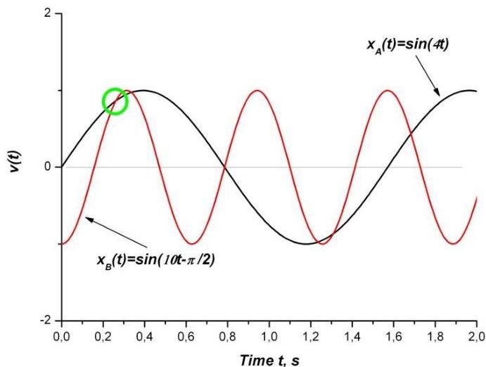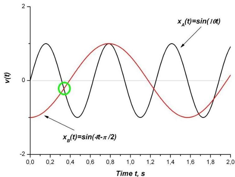 xA(t)=sin(ωAt),xB(t)=sin(ωBt−2π)