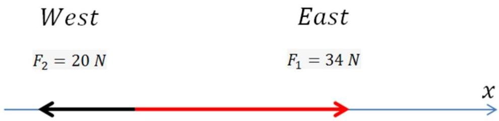 Given. F1=34NF_{1} = 34NF1=34N , East; F2=20NF_{2} = 20NF2=20N , West.