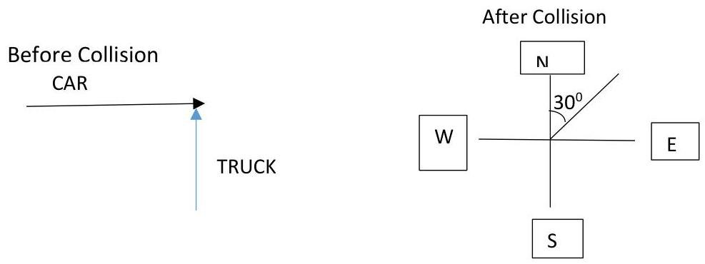 Question: At a crossing a truck travelling towards the north collides with a car travelling towards the east. After the collision the car and the truck stick together and move off at an angle of east of north. If the speed of the car before the collision was 20 ms-1, and the mass of the truck is twice the mass of the car, calculate the speed of the truck before and after the collision.