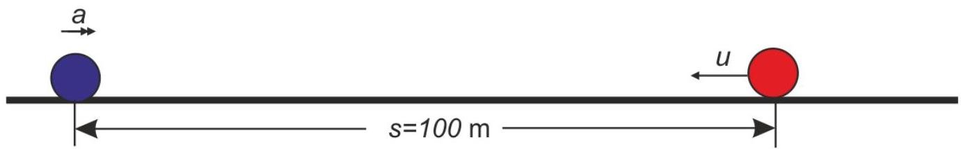 A truck accelerates from rest directly towards a car leaving a parking garage. The car has a constant velocity of towards the truck. The truck accelerates towards the car from away. The collision takes seconds to occur. The truck has a constant rate of acceleration.