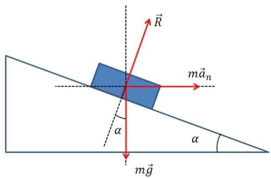 +↑∑Fy=0:Rcosα−mg=0→R=cosαmg.→+∑Fx=man:Rsinα=mrv2→cosαmgsinα=mrv2→tanα=grv2.α=arctgα=arctggrv2=arctg9.81⋅100302=42.53∘.R=cosαmg=cos42.53∘1000⋅9.81=13312N.