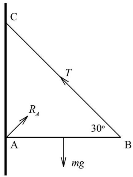 A horizontal rod with a mass of 10kg and length 12m hinged to a wall at one end and supported by a cable which make an angle of 30deg with the rod at its other end. Calculate the tension in the cable and force exerted by hinge .Draw the diagram.