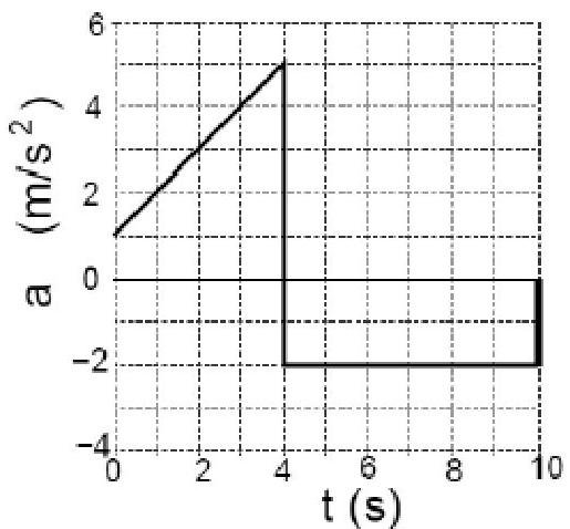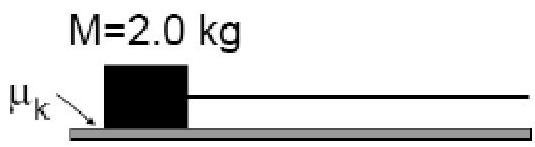 You have a block that moves on a linear path on a horizontal surface. The block is initially moving to the right. The coefficient of kinetic friction between the block and the path is . Attached to the block is a horizontally mounted massless string as shown in the figure below. The block includes an accelerometer which records acceleration vs. time. As you increase the tension in the rope the block experiences an increasingly positive acceleration. At some point in time the rope snaps and then the block slides to a stop (at a time of 10 seconds). Gravity, with . m/s2, acts downward.