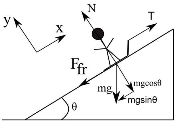 ∑Fx=max,T−mgsinθ−Ffr=ma,∑Fy=may=0,N−mgcosθ=0,N=mgcosθ.